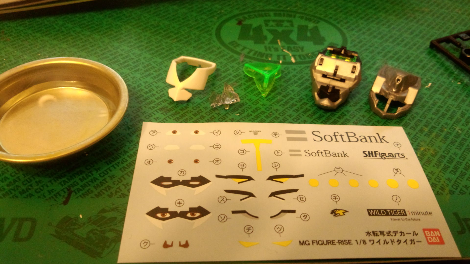 MG1/8ワイルドタイガー頭から胴体まで わかりにくいが顎だけで3層のパーツに分かれてる マジよくできてる 水転写デカール ワイルドに貼るぜ! 苦手な作業なので案の定一枚割った 一部保険の通常シールで事なきを得る インナースーツを組む スーツ外装が控えている分インナースーツは妙なバランス C9やるから今日はここまで
