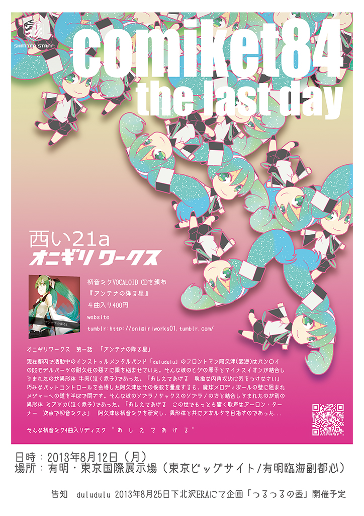 1日目、2日目に参加された方お疲れ様でした 2日目の館内では例によって雲が出現したようです 我々の参加する明日は1、2日目に比べ気温が落ち着く予報が出てますのでそれを信じて・・・ 今回頒布するのは初音ミクオリジナルVOCALOID CD『アンテナの降る星』4曲入り400円です! それでは有明で! 告知ページ:tumblr オニギリワークス