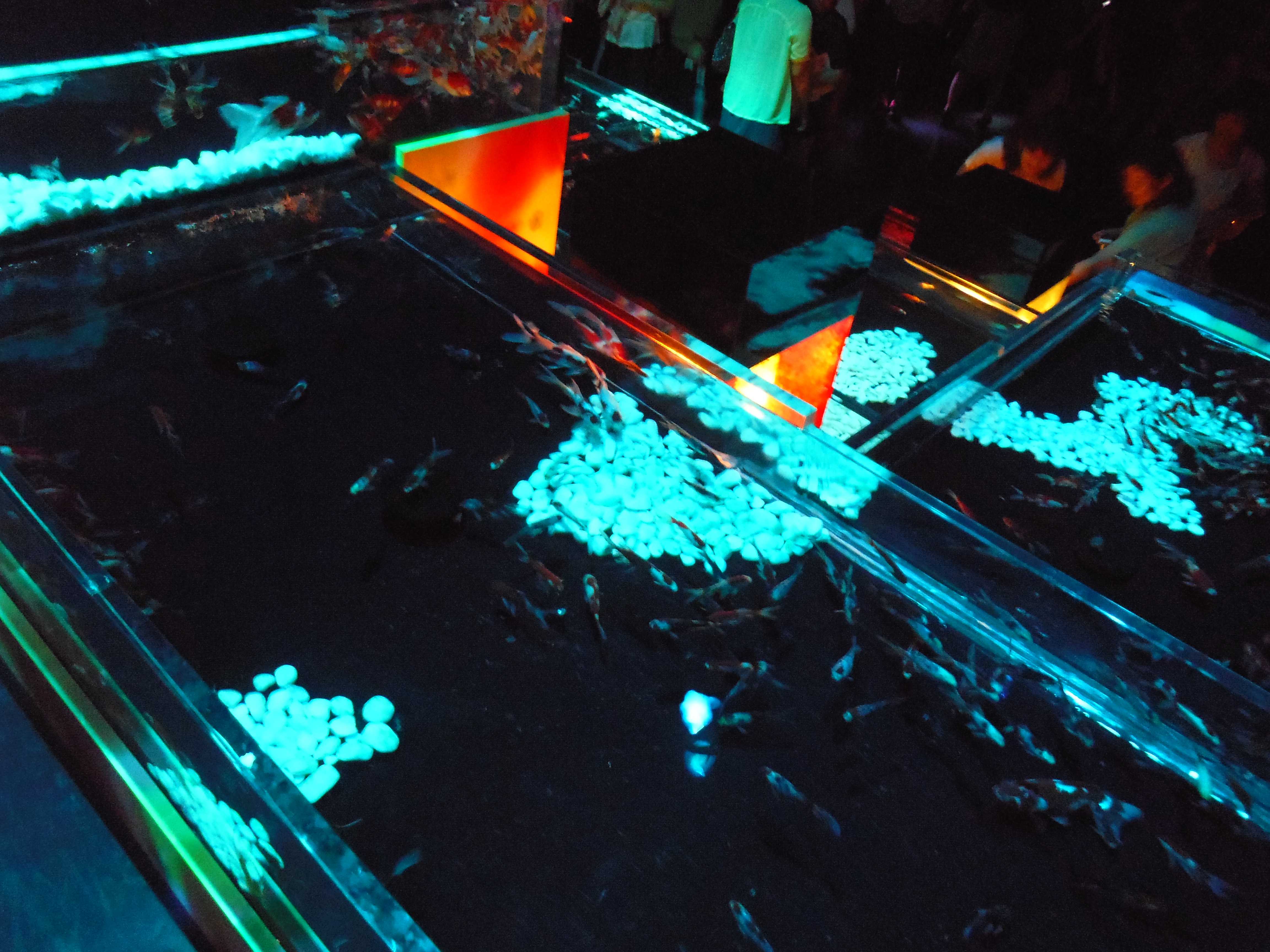 絵巻物的な演出で背景のスクリーンに手前のプロジェクターから映像を水槽内へ透過させて投影