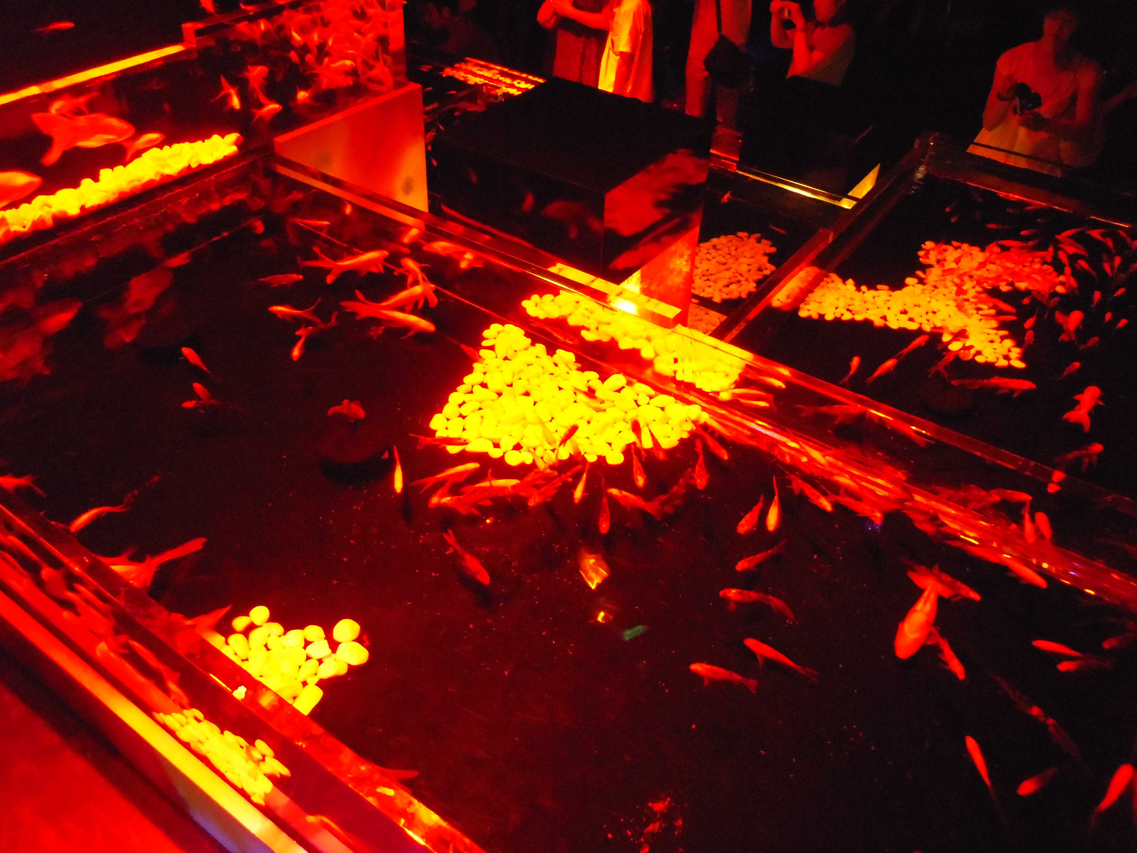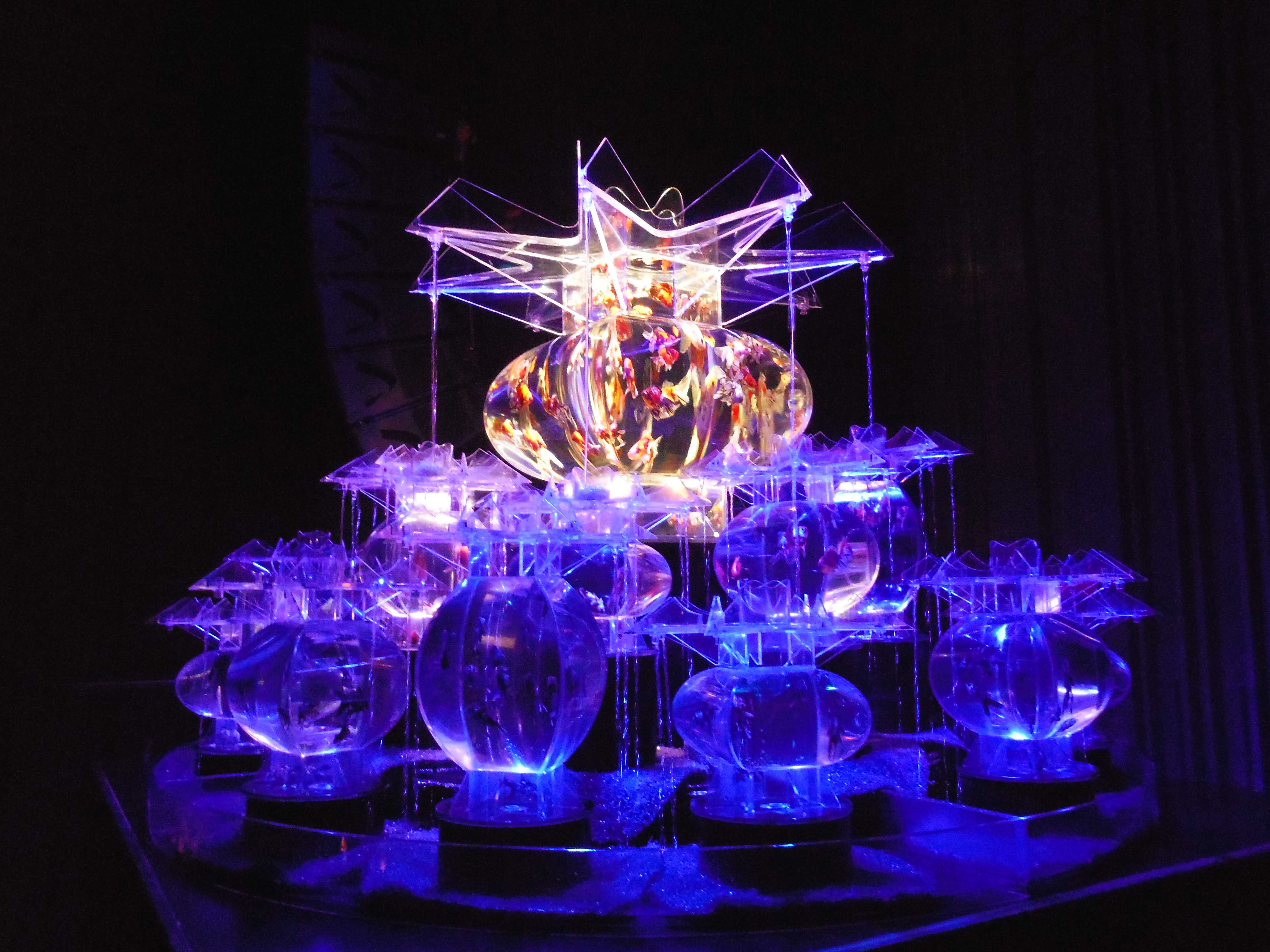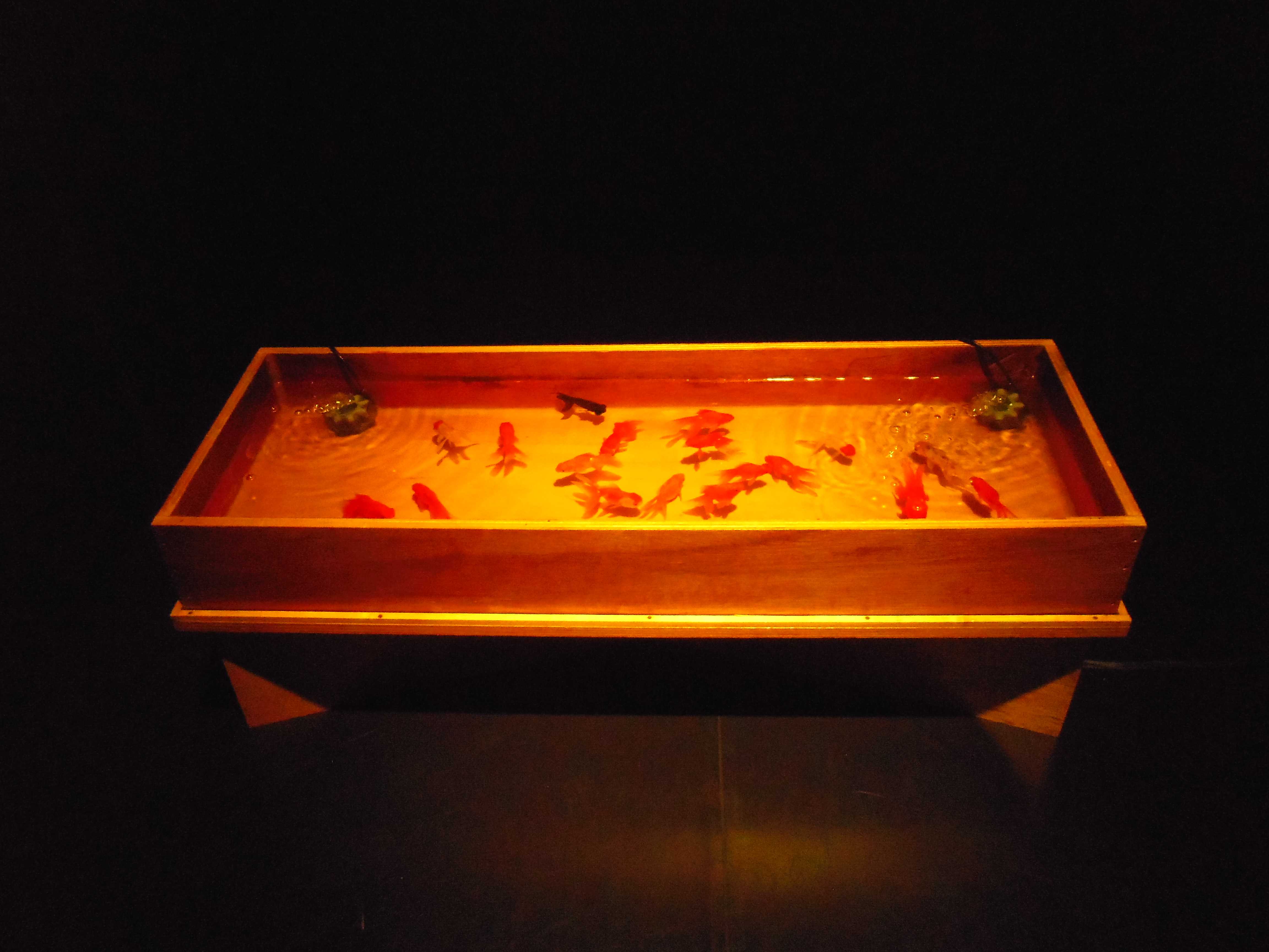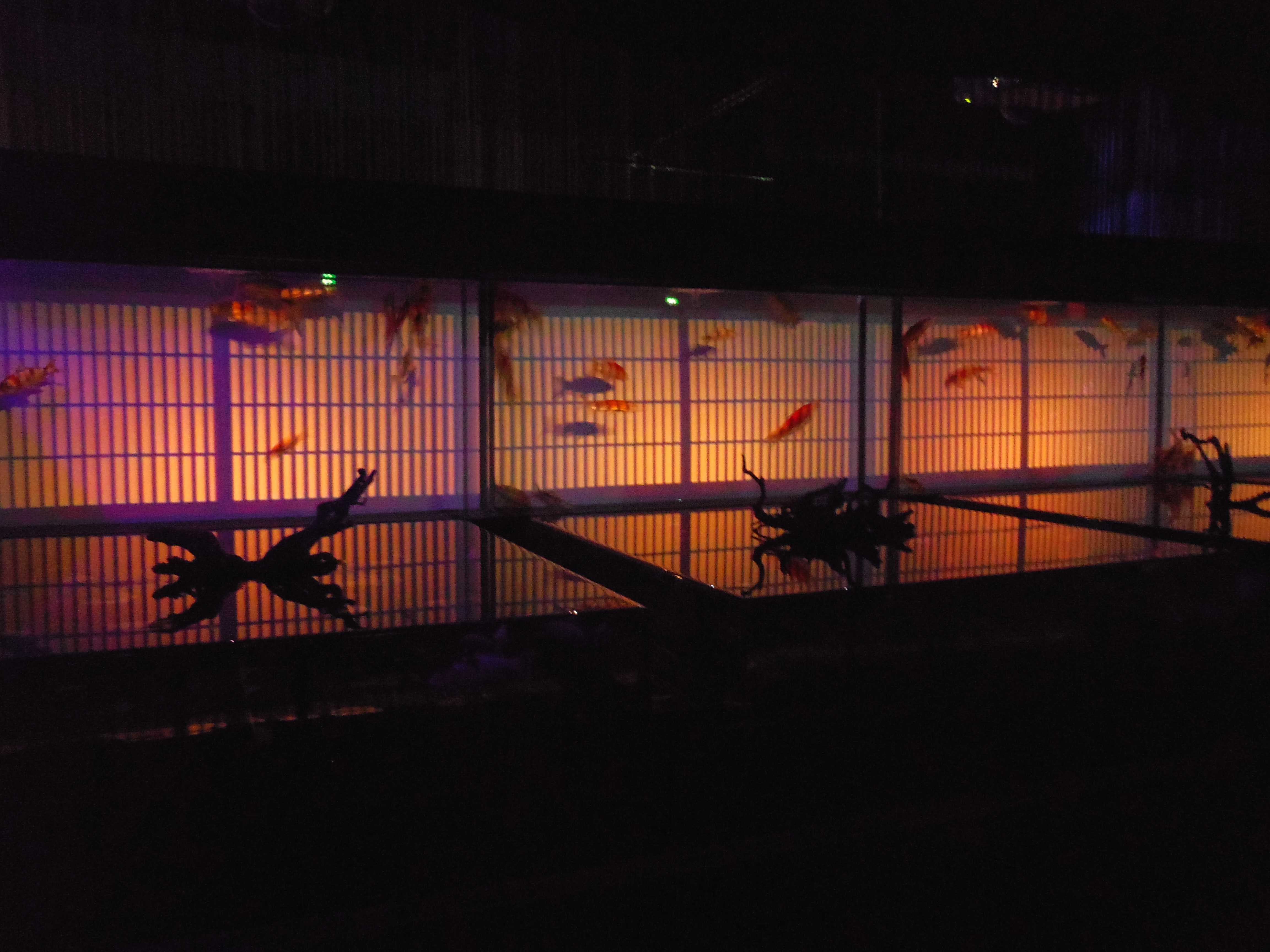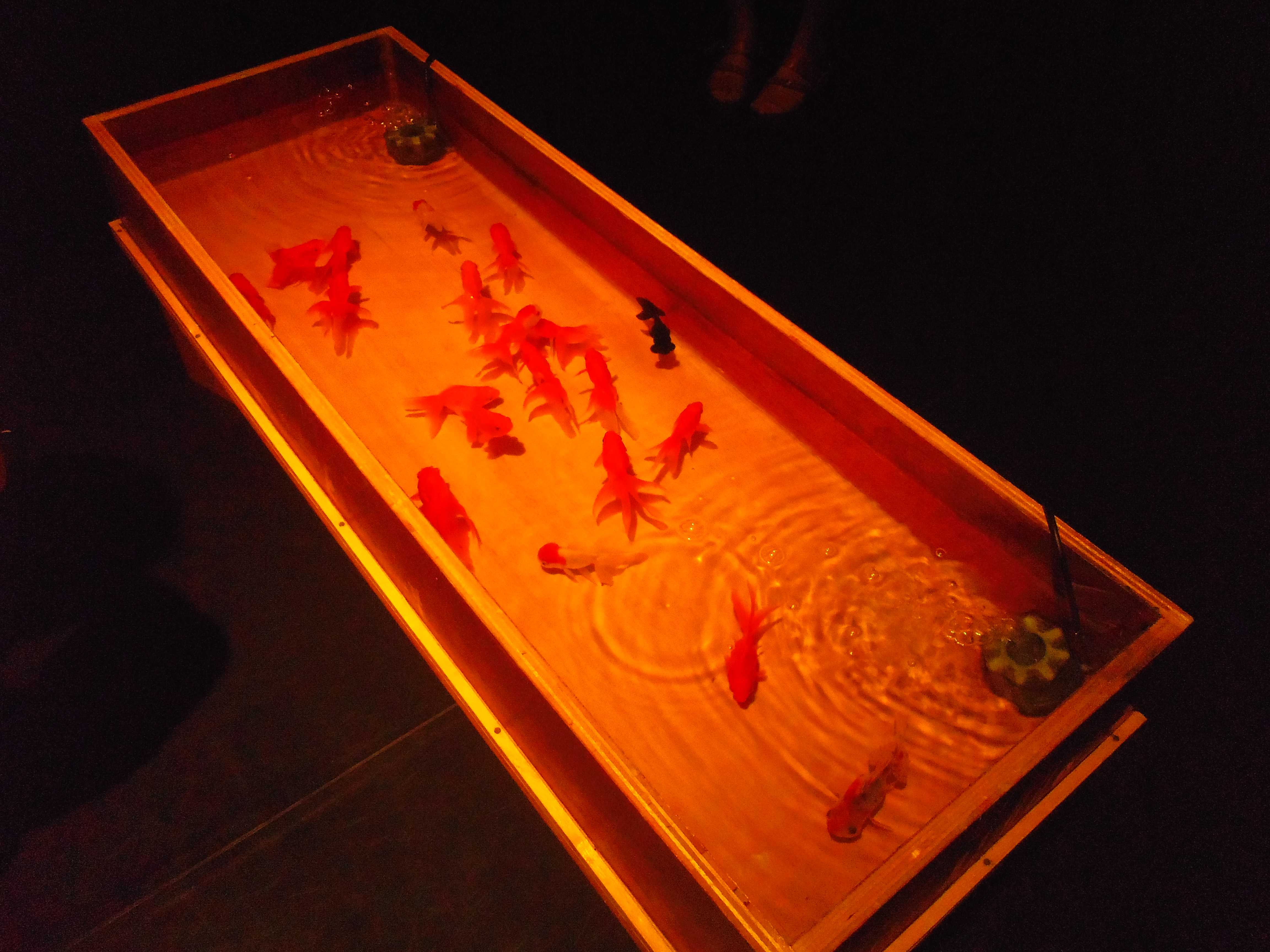絵巻物的な演出で背景のスクリーンに手前のプロジェクターから映像を水槽内へ透過させて投影