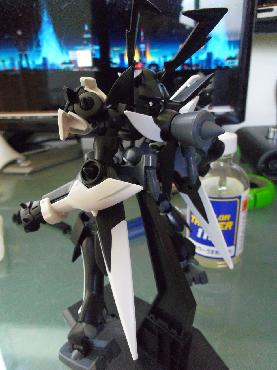 バンシィと同じ色の塗装部分があったので一緒に塗ったったミスターブシドーのブシドーブランドの一つスサノオこれ以上ヒドイMSデザインもないのだがミスターブシドーのキャラ補正で好きな機体黒いとこはメタリックブラックで白いとこはパールホワイトで作りこむ気はないのでこれでおしまいわかりにくいが細かい粒子でラメラメさせているスサノオの脛あてをスミイレしたら虚無ってる顔が出てきたザクスナ ヨンム・カークス機の顔に付けてみたこれはこれでなかなか・・・