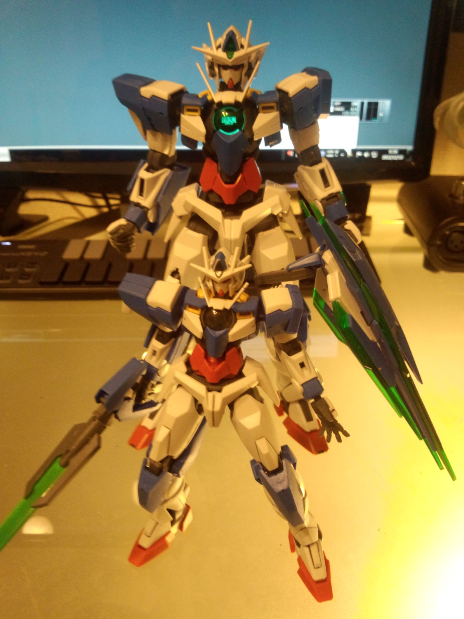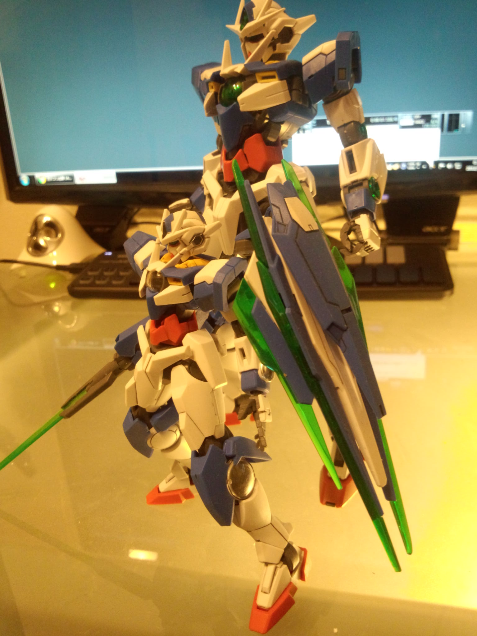 秋葉LAOXの展示品を観てしまい瞬間お買い上げしてしまった1/100MGモデル00 QAN[T] HG1/144サイズモデルを組んでバランスの良さに手を叩いて喜んでいたのは半年も前 飾るにはMGはデカくて場所に困るので避けていたのだが結果買ってよかった 細マッチョ感ではHGのほうが勝っているけどトータルマッチョではMGの勝ち 00作品はGNドライブで全てうやむやにすることにして宇宙世紀の様にバーニアで飾らないのがいい もうガンダムってよりか壽屋のフレームアームス、海洋堂のアッセンブルボーグから出したほうが寧ろ自然かも 仮組み HGより面の増えた金玉からもも HG比較 MG、HG、SD
