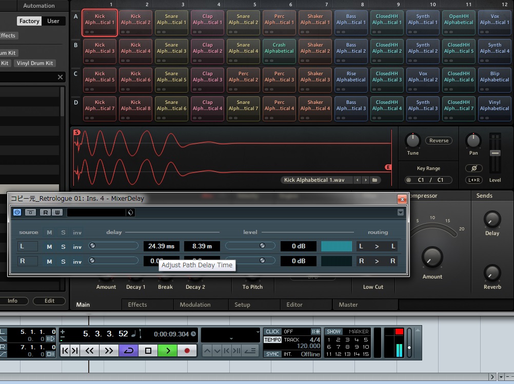 LR左右の内片一方をcubase6標準装備のmixer delayで0.0何秒ズラす