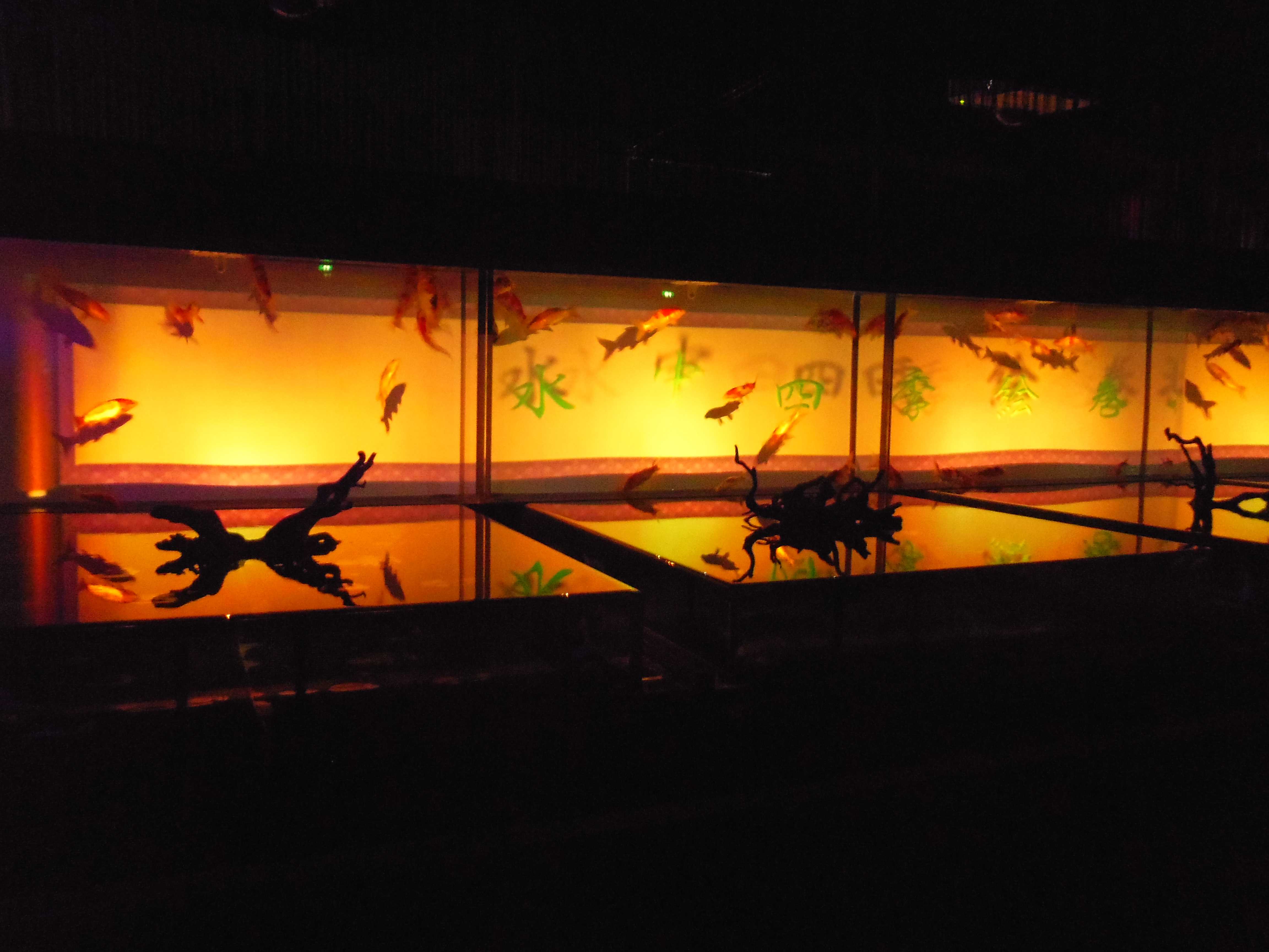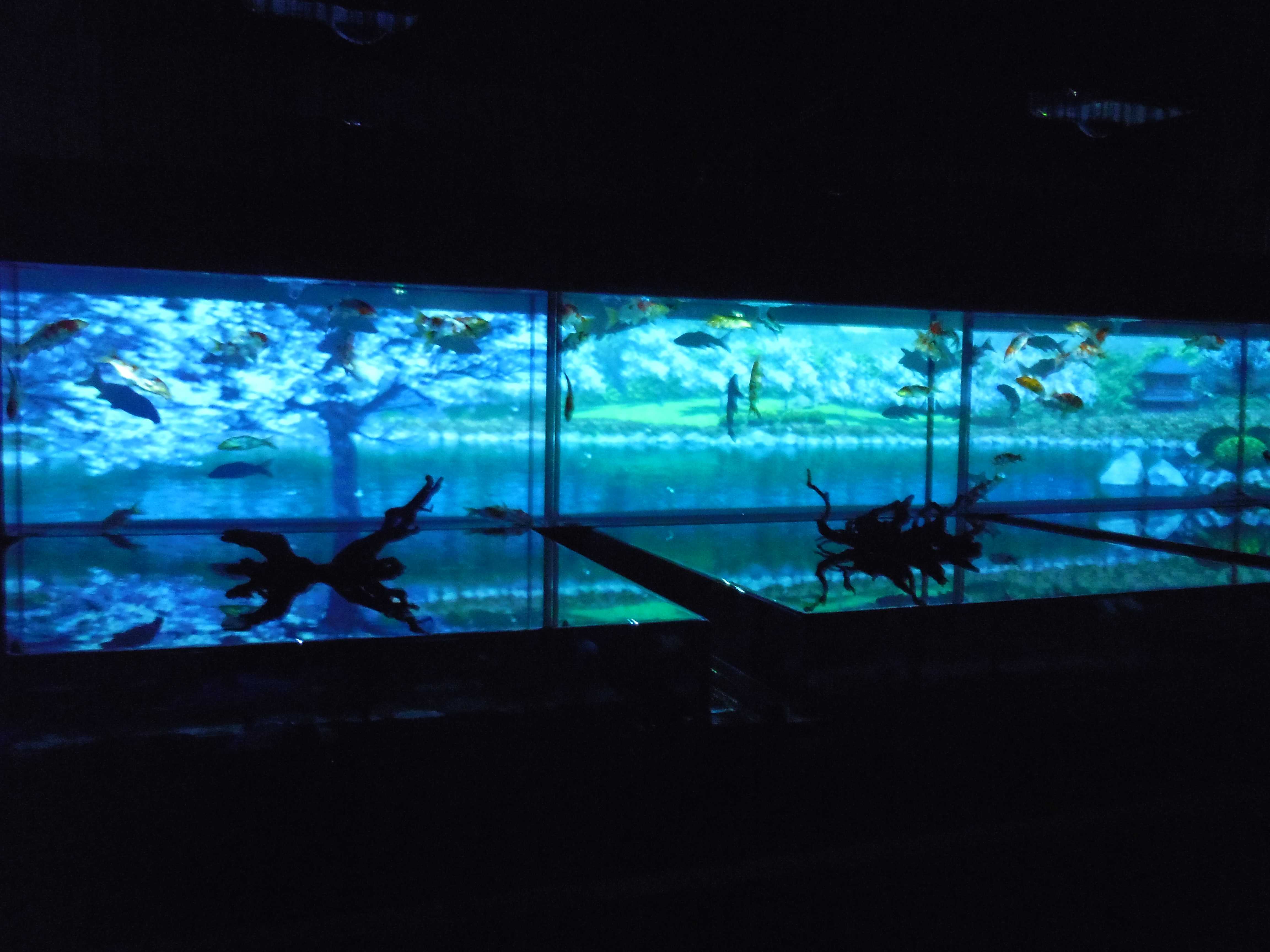 絵巻物的な演出で背景のスクリーンに手前のプロジェクターから映像を水槽内へ透過させて投影